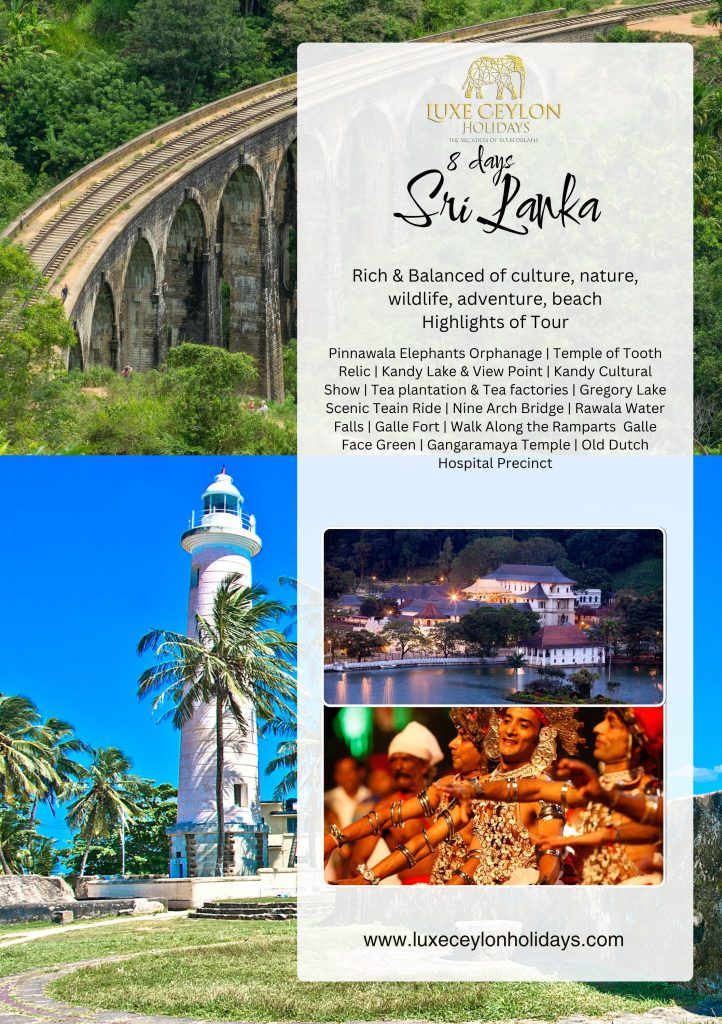 Pinnawala Elephants Orphanage | Temple of Tooth Relic | Kandy Lake & View Point | Kandy Cultural Show | Tea plantation & Tea factories | Gregory Lake Scenic Teain Ride | Nine Arch Bridge | Rawala Water Falls | Galle Fort | Walk Along the Ramparts Galle Face Green | Gangaramaya Temple | Old Dutch Hospital Precinct