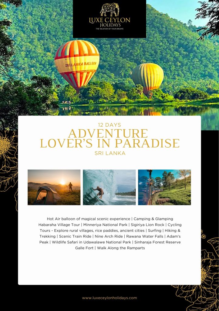 Hot Air balloon of magical scenic experience | Camping & Glamping Habaraha Village Tour | Minneriya National Park | Sigiriya Lion Rock | Cycling Tours – Explore rural villages, rice paddies, ancient cities | Surfing | Hiking & Trekking | Scenic Train Ride | Nine Arch Ride | Rawana Water Falls | Adam’s Peak | Wildlife Safari in Udawalawe National Park | Sinharaja Forest Reserve Galle Fort | Walk Along the Ramparts