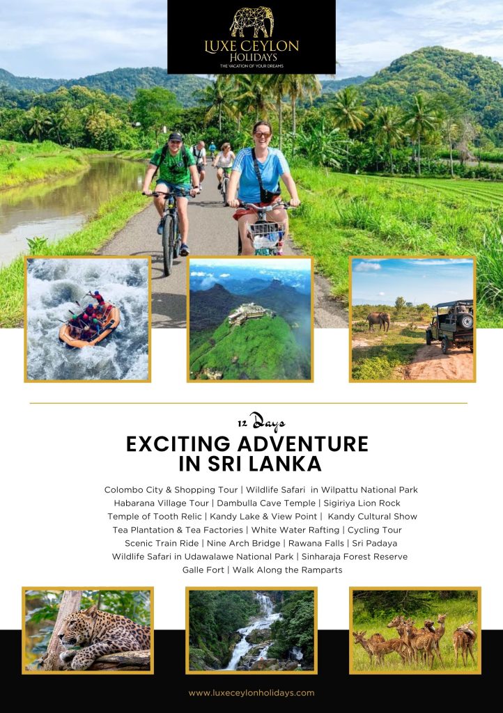 Colombo City & Shopping Tour | Wildlife Safari in Wilpattu National Park Habarana Village Tour | Dambulla Cave Temple | Sigiriya Lion Rock Temple of Tooth Relic | Kandy Lake & View Point | Kandy Cultural Show Tea Plantation & Tea Factories | White Water Rafting | Cycling Tour | Scenic Train Ride | Nine Arch Bridge | Rawana Falls | Sri Padaya | Wildlife Safari in Udawalawe National Park | Sinharaja Forest Reserve | Galle Fort | Walk Along the Ramparts