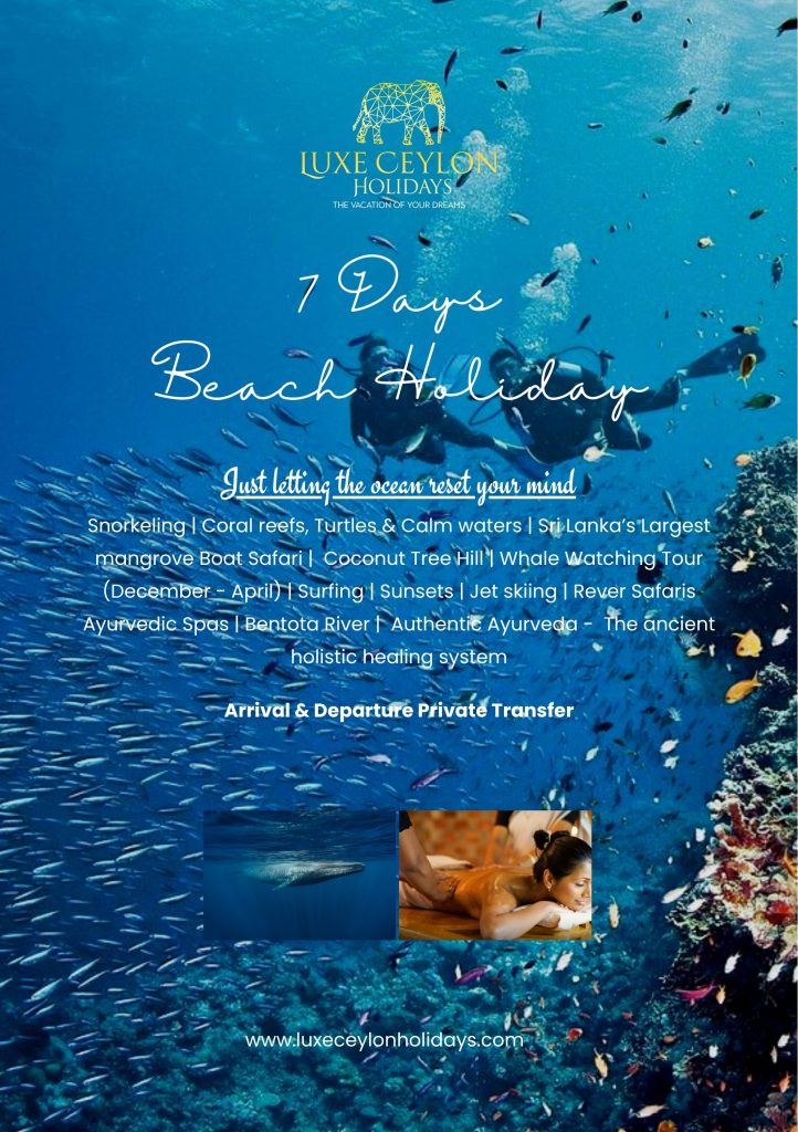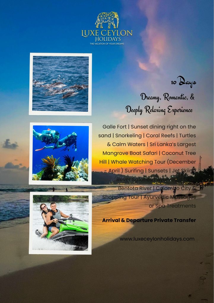 Galle Fort | Sunset dining right on the sand | Snorkeling | Coral Reefs | Turtles & Calm Waters | Sri Lanka’s Largest Mangrove Boat Safari | Coconut Tree Hill | Whale Watching Tour (December – April ) Surifing | Sunsets | Jet Skiing Rever Safaries | Ayurvedic Spas Bentota River | Colombo City & Shopping Tour | Ayurvedic Massages or Spa Treatments