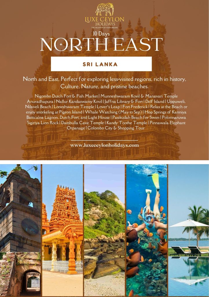 Nigombo Dutch Fort & Fish Market | Munneshwaram Kovil & Manavari Temple Anuradhapura | Nallur Kandaswamy Kovil | Jaffna Library & Fort | Delf Island | Uppuweli, Nilaveli Beach | Loneshwaram Temple | Lover’s Leap | Fort Frederick | Relax at the Beach or enjoy snorkeling at Pigeon Island | Whale Watching (May to Sep) | Hop Springs of Kanniya Batticaloa Lagoon, Dutch Fort, and Light House | Pasikudah Beach for Swim | Polonnaruwa Sigiriya Lion Rock | Dambulla Cave Temple | Kandy Toothe Temple | Pinnawala Elephant Orpanage | Colombo City & Shopping Tour