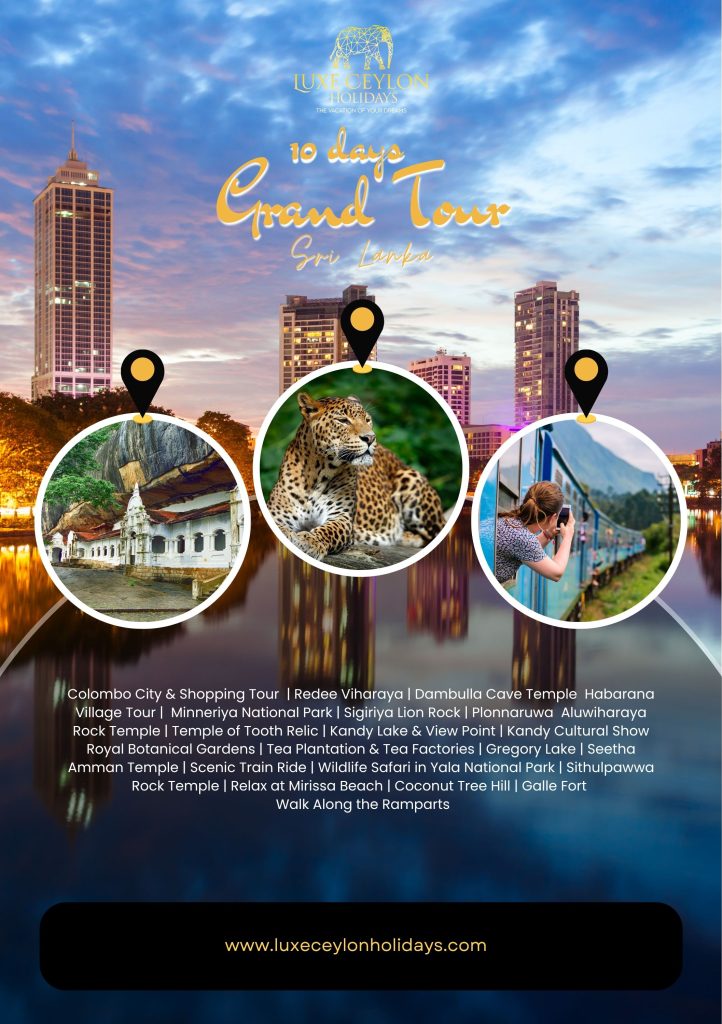 Colombo City & Shopping Tour | Redee Viharaya | Dambulla Cave Temple Habarana Village Tour | Minneriya National Park | Sigiriya Lion Rock | Plonnaruwa Aluwiharaya Rock Temple | Temple of Tooth Relic | Kandy Lake & View Point | Kandy Cultural Show Royal Botanical Gardens | Tea Plantation & Tea Factories | Gregory Lake | Seetha Amman Temple | Scenic Train Ride | Wildlife Safari in Yala National Park | Sithulpawwa Rock Temple | Relax at Mirissa Beach | Coconut Tree Hill | Galle Fort | Walk Along the Ramparts