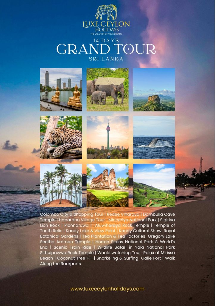 Colombo City & Shopping Tour | Redee Viharaya | Dambulla Cave Temple | Habarana Village Tour Minneriya National Park | Sigiriya Lion Rock | Plonnaruwa | Aluwiharaya Rock Temple | Temple of Tooth Relic | Kandy Lake & View Point | Kandy Cultural Show Royal Botanical Gardens | Tea Plantation & Tea Factories Gregory Lake Seetha Amman Temple | Horton Plains National Park & World’s End | Scenic Train Ride | Wildlife Safari in Yala National Park Sithulpawwa Rock Temple | Whale watching Tour Relax at Mirissa Beach | Coconut Tree Hill | Snorkeling & Surfing Galle Fort | Walk Along the Ramparts